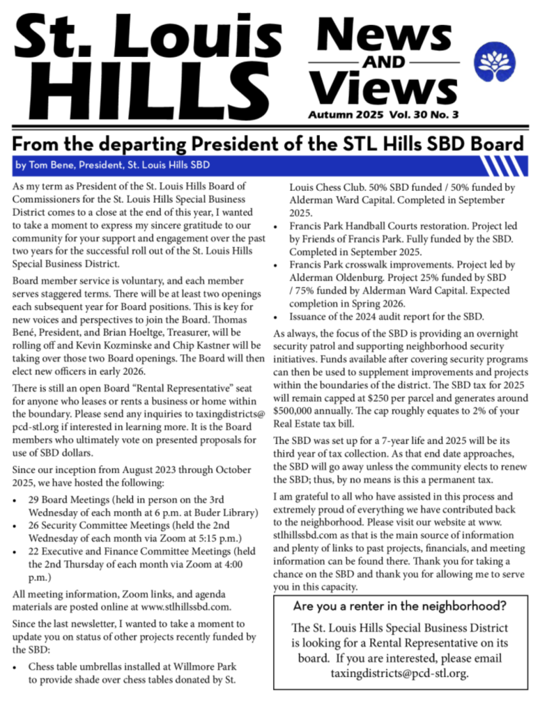 Archived newsletter (Saint Louis Hills – News and Views) available for view here.