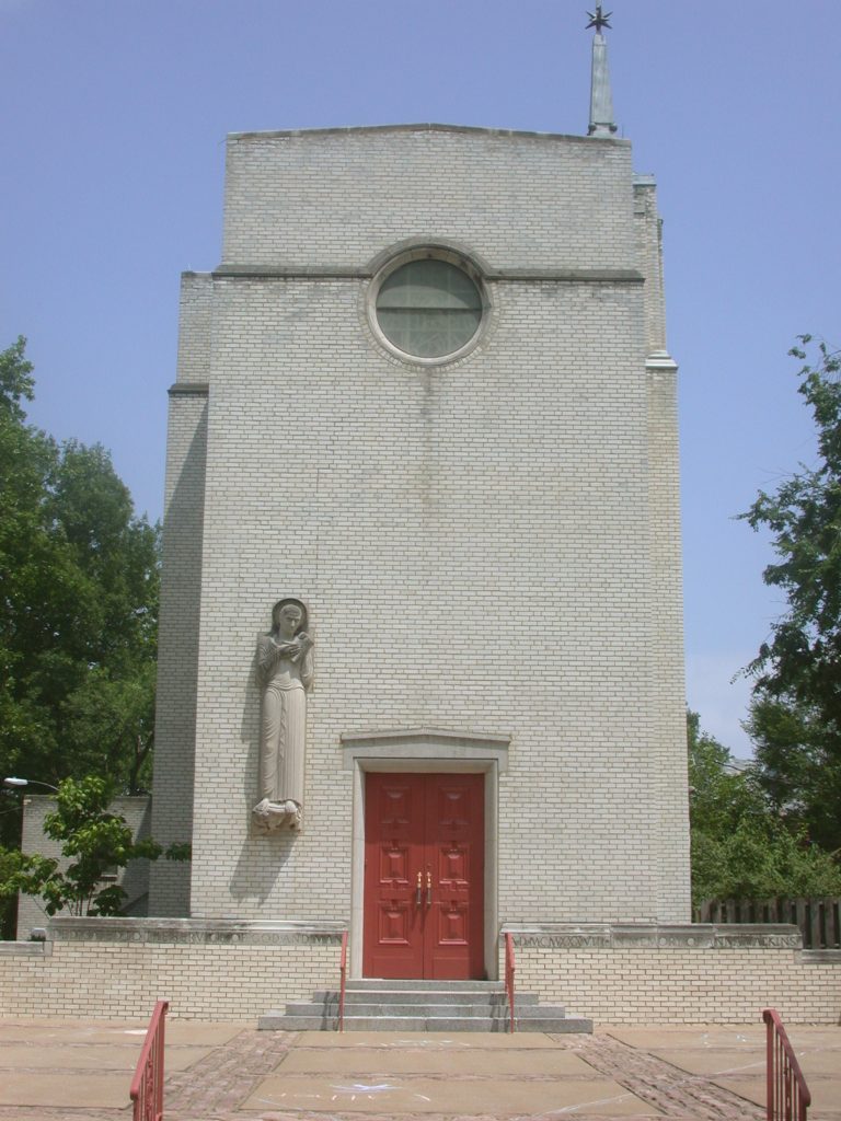 The City’s first church in a contemporary style, St. Mark’s was dedicated in 1939. Designed by the partnership of St. Louis architects Charles Nagel and Frederick Dunn, the elegantly simple building displays the work of many local craftsmen and artisans, including the statue of St. Mark by Sheila Burlingame. Burlingame was a student of Carl Milles, nationally-recognized sculptor, who produced the magnificent Meeting of the Waters in Aloe Plaza (City Landmark #15).